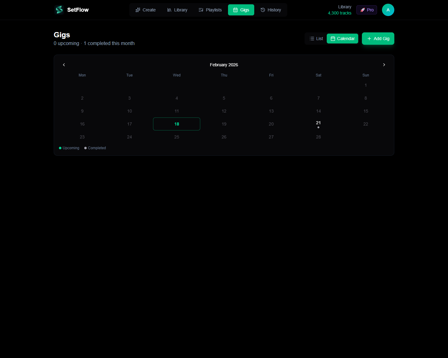 Great sets don't happen in isolation — they happen at gigs. The new Gig Calendar in SetFlow connects your set preparation to your real-world bookings so you always know what you're playing, where, and when.