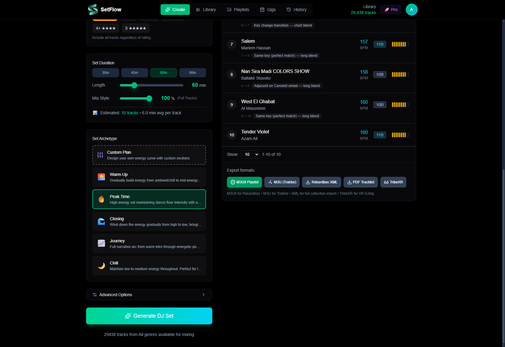 Import your Rekordbox library and generate perfectly mixed DJ sets in seconds.